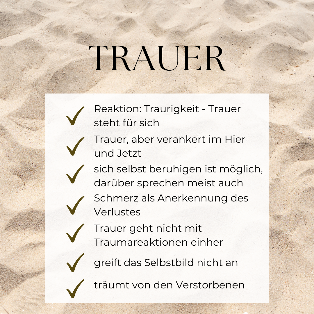 Bei der Verarbeitung von Traumata sind Trauerprozesse ein wesentlicher Bestandteil. Dennoch kann es zu Verwirrung führen: Das Trauma ist möglicherweise bearbeitet und plötzlich stellen sich schmerzhafte Gefühle der Trauer ein. Daher ist es hilfreich, zu unterscheiden, wie sich Trauma und wie sich Trauer darstellt.